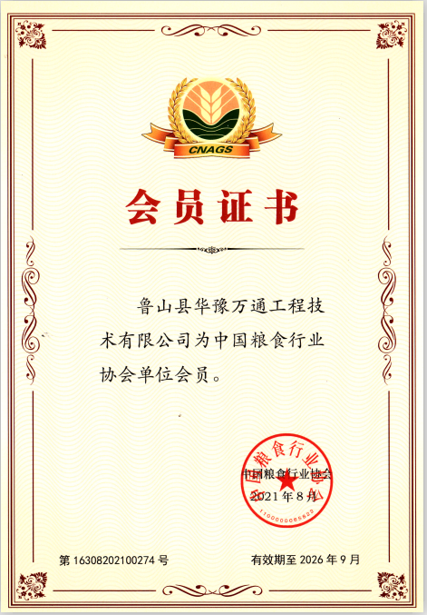 2021年8月,中國糧食行業協會經多方位考察,授予魯山縣華豫萬通工程技術有限公司評會員單位稱號,并頒發會員單位證書。