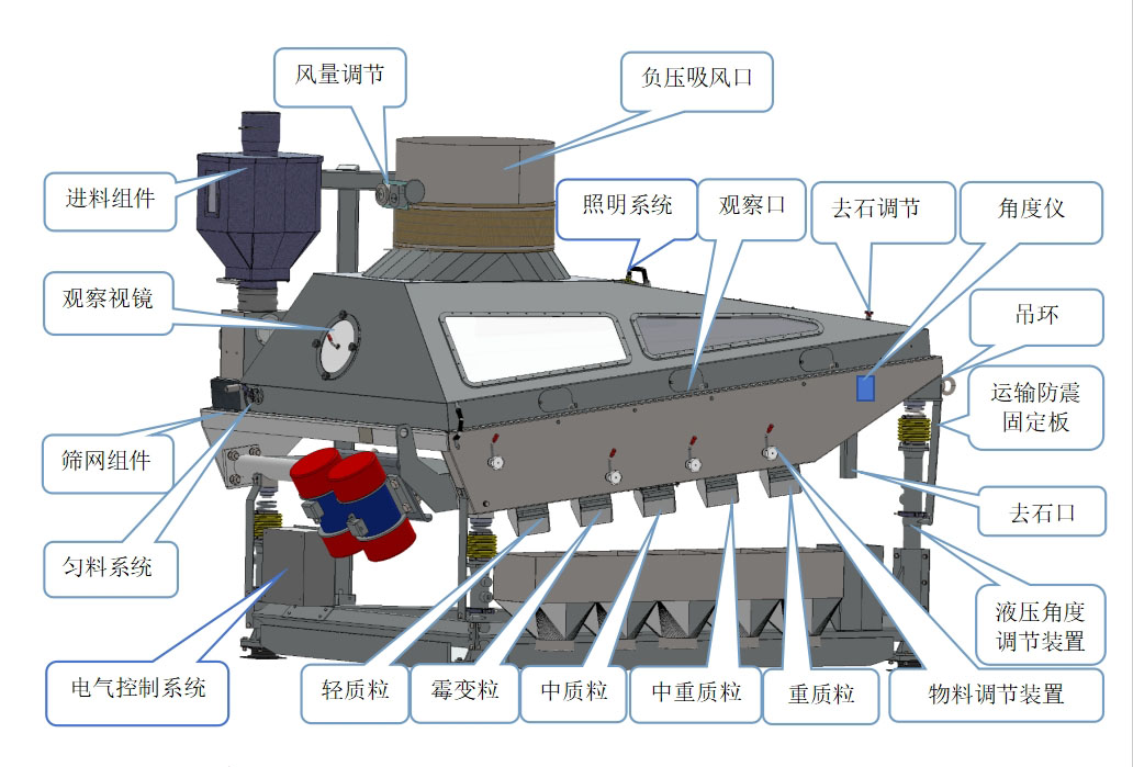 3.出料端設計六級比重不同的物料出口,可有效分離出石子、重質粒、中重質粒、中質粒、霉變粒、輕質粒。